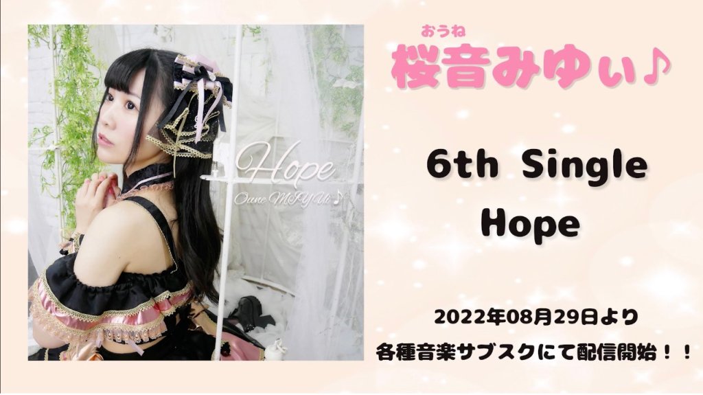 みゆぃ♪-6th Single Hope Posted byMIYUiみゆぃ♪1 Oct 202210 Oct 2023Posted in桜音みゆぃ♪情報 桜音みゆぃ♪の楽曲 6th Single Hope 8月29日リリース! 各種音楽サブスク配信中! ぜひ聴いてみてね! Hope URLリスト https://miyui.info/miyui-6th-single-hope/ Share this: Click to share on X (Opens in new window) X Click to share on Facebook (Opens in new window) Facebook Like Loading...