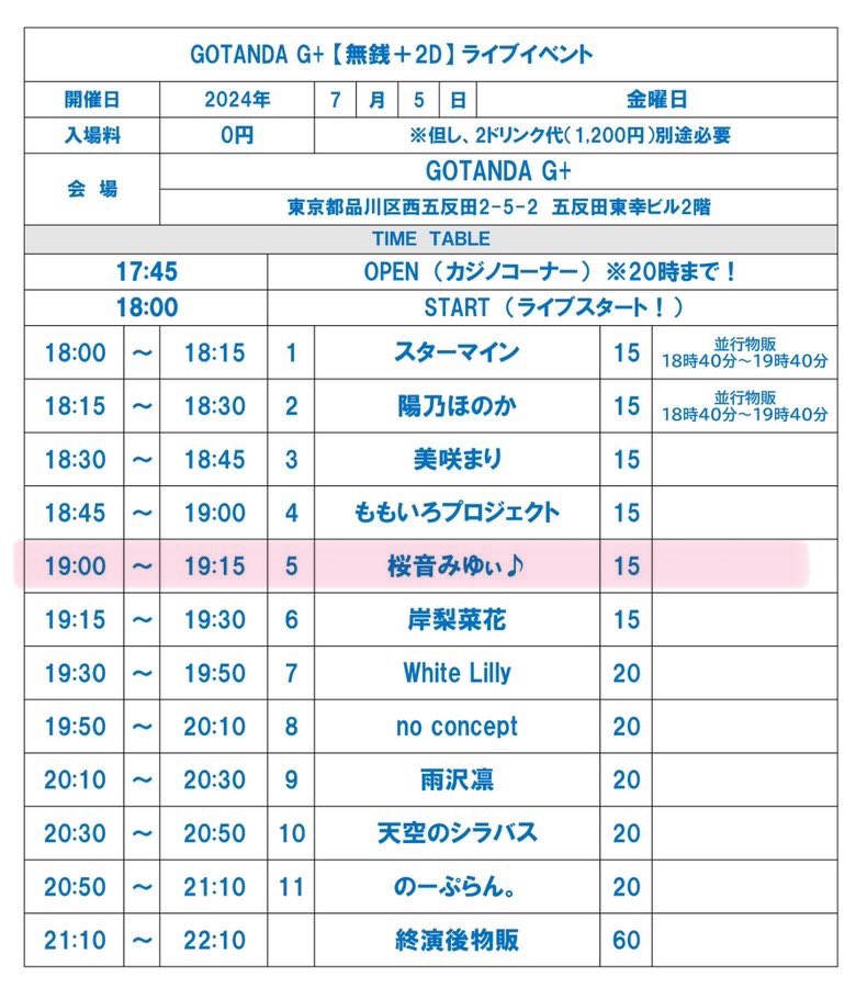 7/5(金)GOTANDA G+ 【無銭+2D】ライブイベント