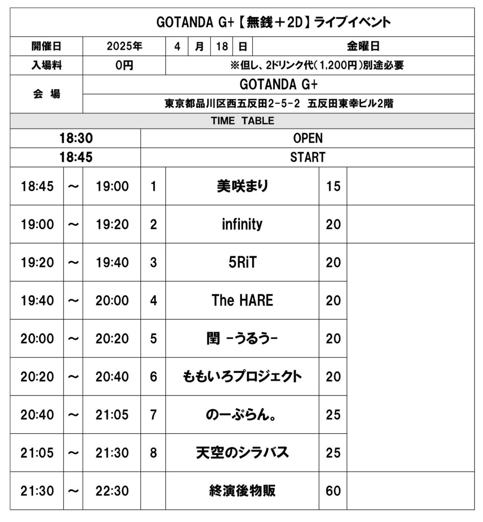 4/18(金)GOTANDA G+ 無銭ライブ