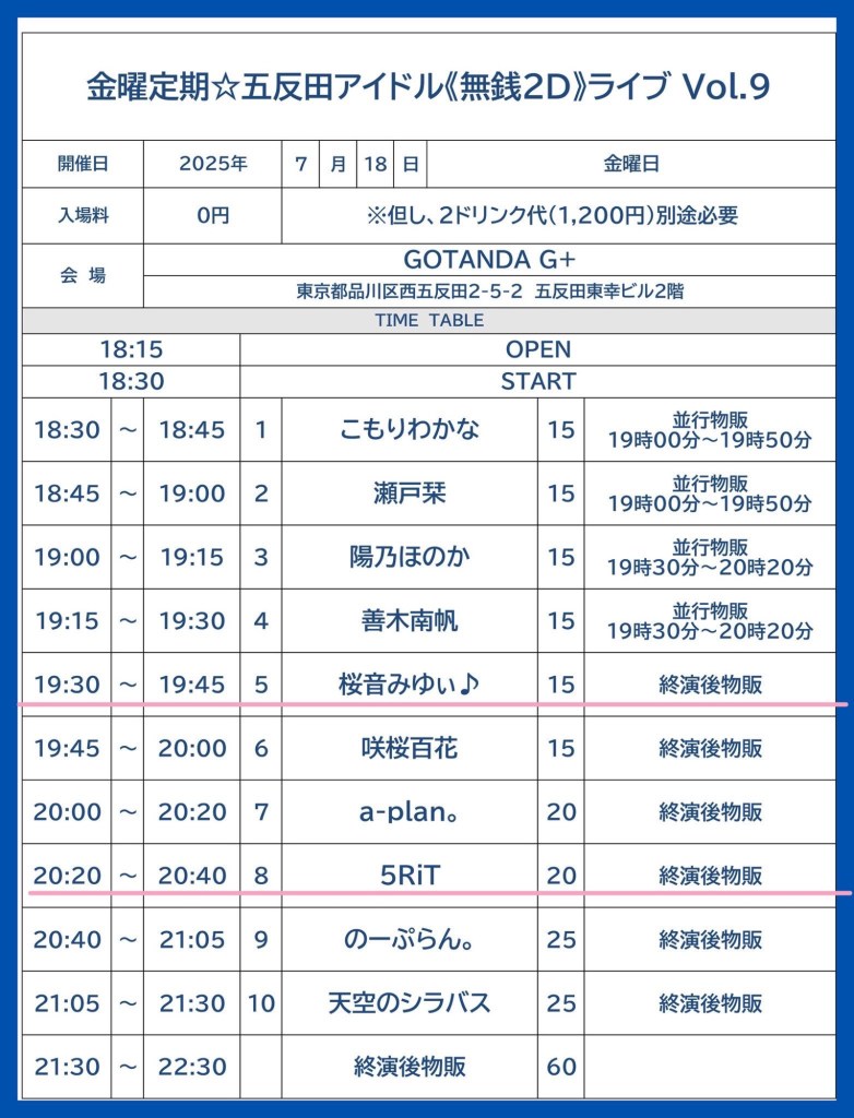 7/18(金)無銭ライブ 五反田アイドル ライブVol.9