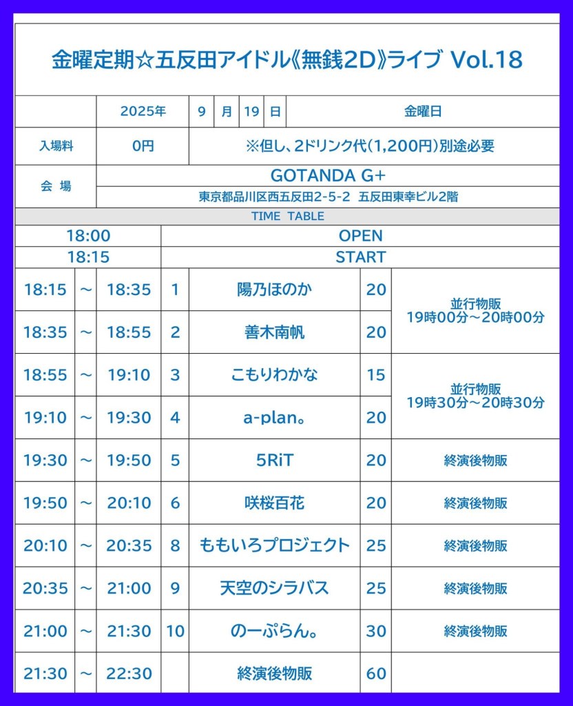 9/19(金)金曜定期☆五反田アイドル《無銭2D》ライブ Vol.18