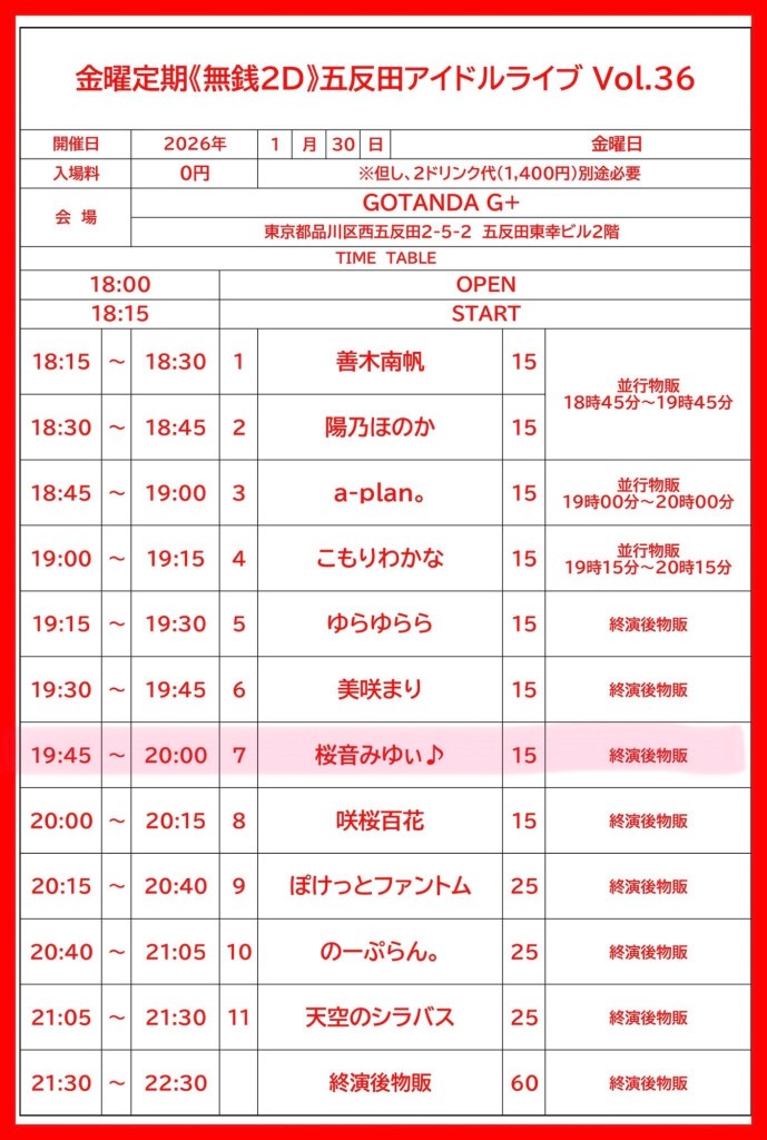 1/30(金)無銭‼️五反田アイドルライブ Vol.36
